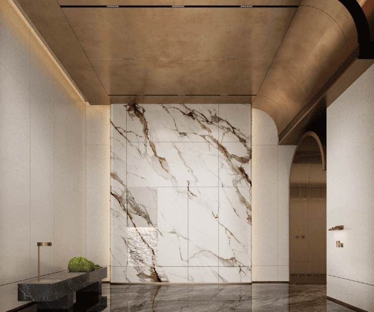 天河润府的公区效果图,从效果图呈现的质感来看,项目公区空间上糅合了高奢酒店的设计理念,石材与金属饰面营造典雅氛围的同时,更强化归家的温馨感与仪式感。