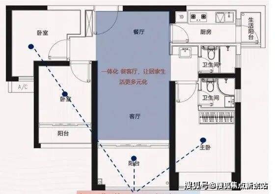 一体化餐客厅:餐客厅+阳台一体化设计,让家人生活空间各有所享