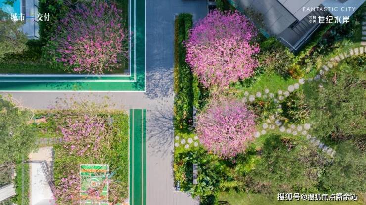 云境入口处,"世纪水岸"鎏金大字立于层层抬高的巨型黑色石基上,一株树龄成熟的绿植点缀其间,繁茂枝叶与绚烂花朵相得益彰,生动诠释了品质生活的美好意境。