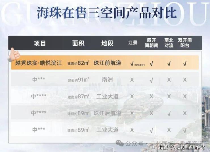 建面82的户型景观和地段外,四开间朝南、南北对流、双开间超大阳台、江景(部分单位)...每一项配置,也都戳中了买家的内心。