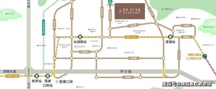 距离地铁2号线莲塘站A出口仅约500米,直达万象城、金光华等商圈,两站即达莲塘口岸。(数据来源:百度地图)