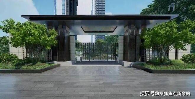 再看金众的设计图中,一一来看,大门让人眼前一亮,现代中式建筑精髓融合现代化格调,沿袭了金众公馆系的基因。超尺度设计,高端大气,美感外溢且内外协调。