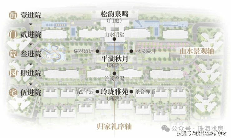 ▫汲取岭南四大名园精华,布局两轴三庭,五进六园,尽显归家礼序。