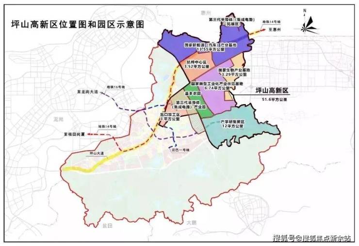 坪山国家级高新区规模宏大,面积高达51.6平方公里,是南山科技园的约5倍之大,可想而知未来的产业施展空间。