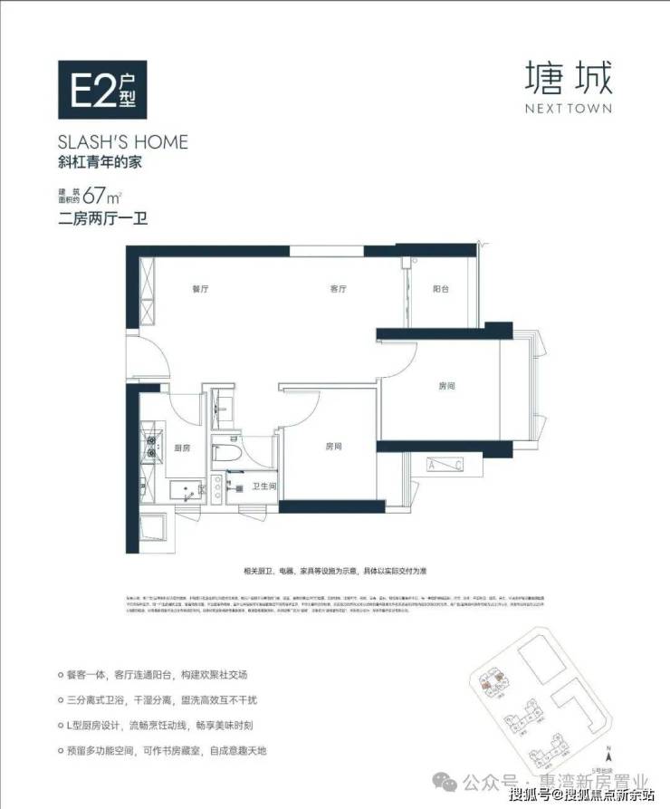 67㎡2房E2户型:位于5栋1单元05、08梯腿,东北/西南朝向,竖厅格局,客厅3.15米开间,餐客一体化设计,L型厨房,主卧约7.55㎡,得房率约80%。