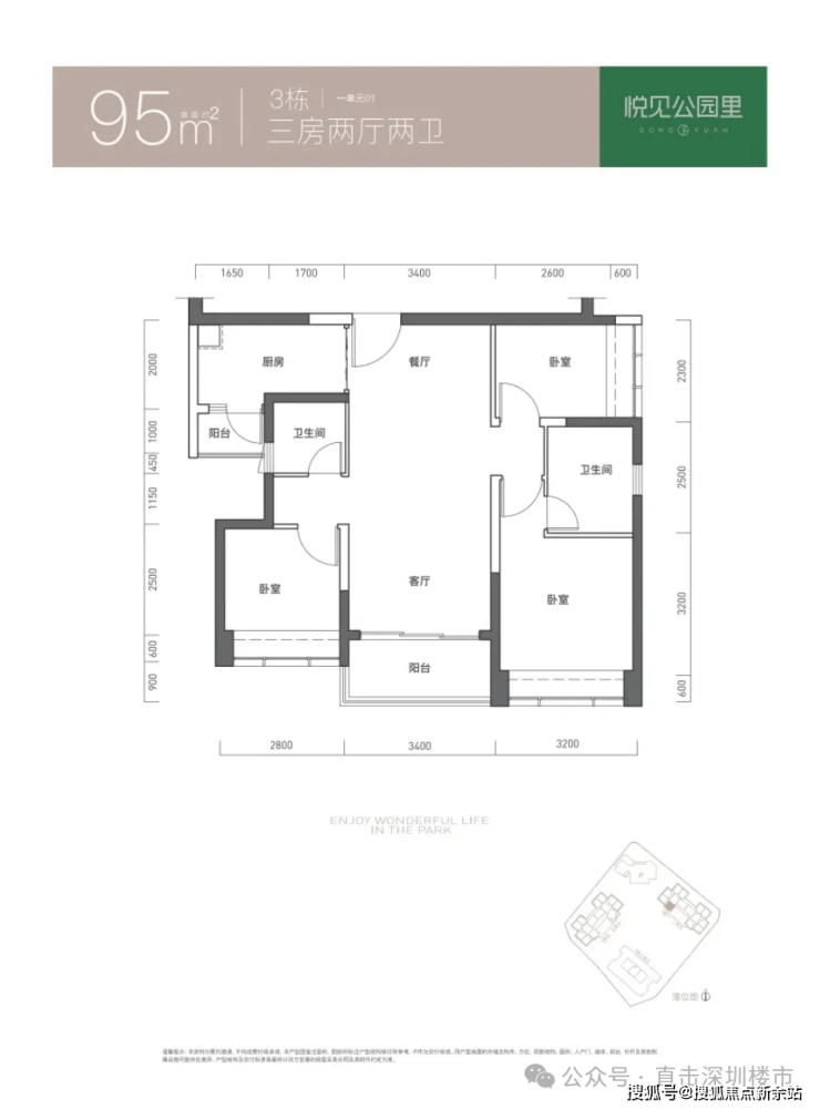 95㎡的3房2厅2卫,仅3栋1单元01户型,设计的是竖厅双龙抱珠格局,客厅3.4米开间,三开间朝南,3个卧室分别做到了主卧11.97㎡/次卧7.47㎡/次卧7.17㎡(实测面积,去掉墙体),L型厨房带1个生活阳台,公卫三段式分离,得房率73.71%(不含赠送),西南朝向。