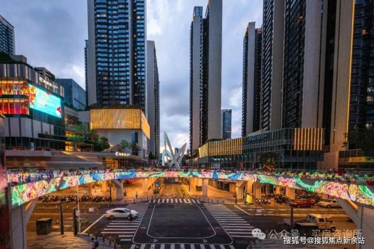 以商业为纽带,在空间上高度聚合各业态,打造一个可以自循环的商业生态圈。设计方面,整个商业由“两个盒子mall+公共平台街区”组成,其中两个盒子间架起三座空中廊桥,除了与连廊相连接外,也与住宅互动,进一步强调了空间围合感。