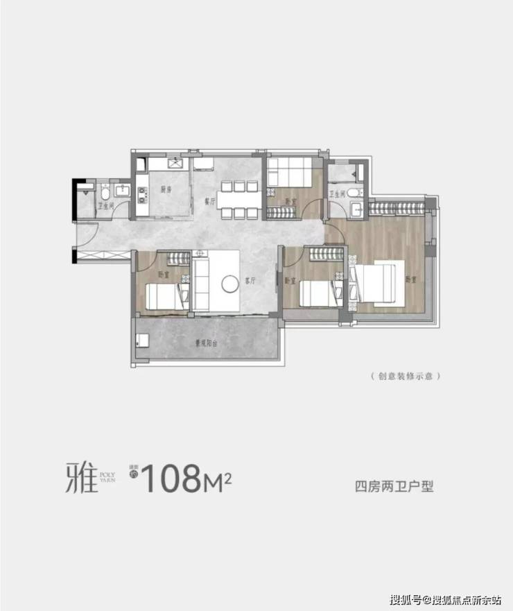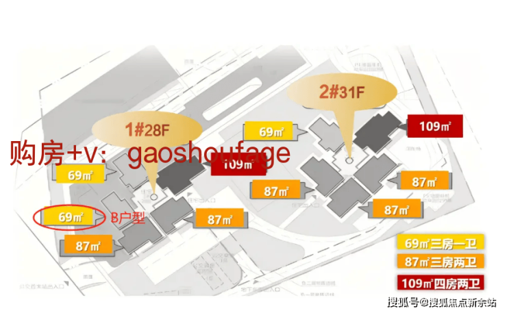 项目将推出建面69-86-108平的三四房,其它86平三房两卫货量最少,占了5条梯腿,108平货量最少,只有60套左右。