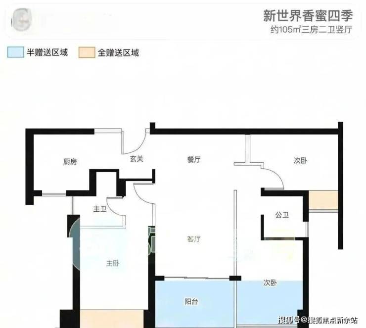 建筑面积约105㎡3房2卫,双龙抱珠户型,较为方正传统,朝向西南。
