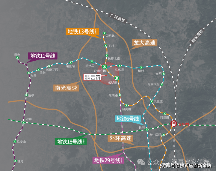 双地铁:6号线公明广场站约1.1km,13号线公明南站(在建)约700m,创享城芯生活