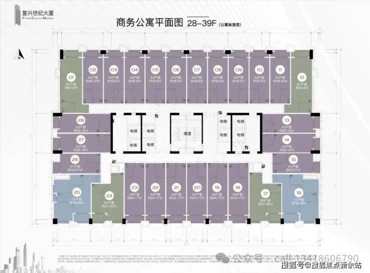 公寓8梯28户,办公6梯15户,商业4梯34户