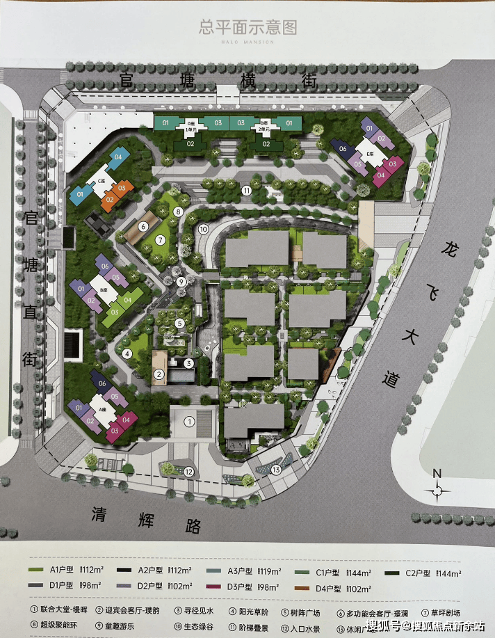 整个楼盘平面图可以看到,项目D栋1单元和2单元户型是2梯3户的正南朝向,其他户型东北、西南、东南三个方向。