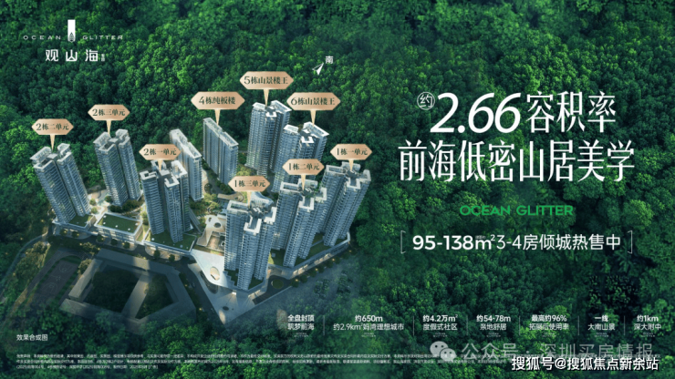 观山海家园:深圳前海唯一低密大社区,270度大小南山景,无保障房,纯享改善宽宅。约2.66容积率,前海低密山居美学,建面约95-138㎡3-4房倾城热售中