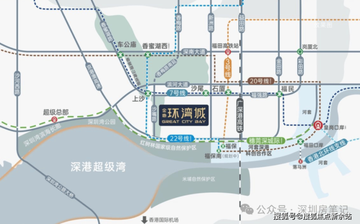 位于福田区福强路与沙嘴路交汇处,地处深港超级湾海岸线核心区域。项目北接香蜜湖新金融中心,南连河套深港科技创新合作区,受益于福田区"三大新引擎"辐射。