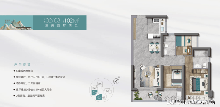 此户型为本次亮点产品,东南或西南朝向,经典竖厅设计,客厅3.7米开间,三开间朝南。客厅连接次卧出6.4米长的大阳台,为家庭休闲、茶叙提供理想空间。U型厨房操作流畅,卫生间干湿分离,主卧套房标配独立卫浴,完美契合改善型客户的核心需求。