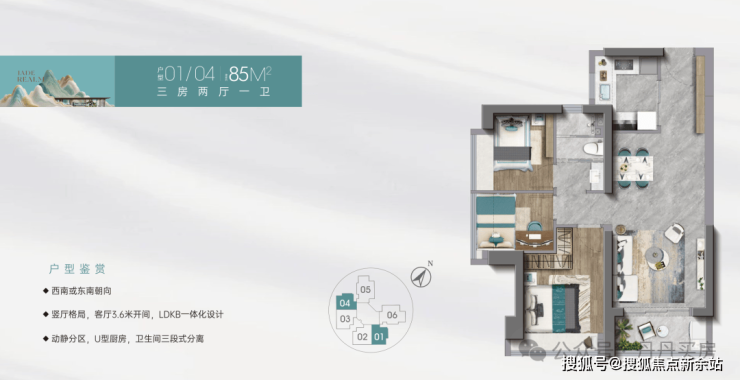 85㎡的3房2厅1卫,设计为竖厅,玄关入户,客厅宽3.55米,LDKB布局,动静分区。卧室面积:主卧13㎡、次卧7.9㎡、次卧5.77㎡(含飘窗)。U型厨房,卫生间三分离。得房率约76%(不含赠送),朝向西南或东南。