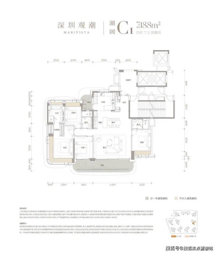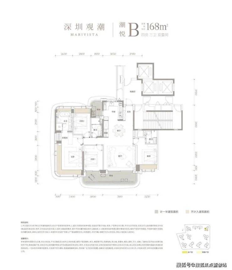 建面约168㎡四房三卫双套间,在深圳改善市场中堪称“起步即舒适”的标杆户型,动静分区清晰合理。户型核心亮点为双套间设计,主卧与一间次卧均配备独立卫浴,私密性拉满;客餐厅一体化连通巨幕阳台,采光面开阔,无论是摆放大尺度沙发,还是打造亲子互动区,空间都绰绰有余。