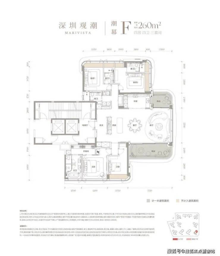 建面约260㎡四房三卫三套间,作为顶格改善大平层,三套间设计是其核心亮点——主卧与两间次卧均带独立卫浴,近乎半数房间为套房配置,无论是三代同堂还是亲友长住,皆能保障全员私密感,在深圳大平层中属于真正的高配水准。搭配270°环景阳台,超大面宽带来极致采光与全景视野,景观资源尽收眼底。