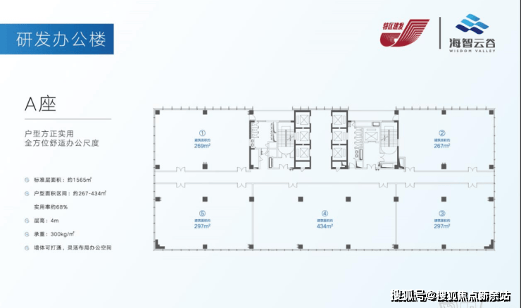 研发办公 创享海洋经济梦想研发办公A座 约2.7万㎡,22层,标准层约1565㎡,每层5户,户型面积区间约267-434㎡,方正实用,可灵活组合,层高4m,荷载300kg/㎡。