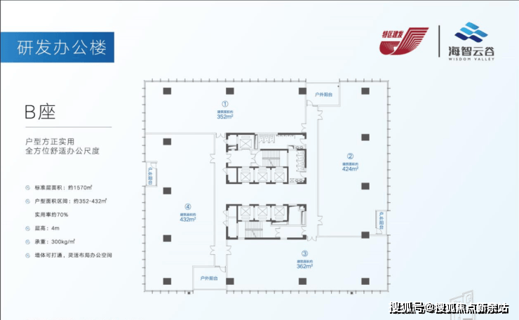 研发办公B座 约2.8万㎡,23层,标准层约1570㎡,层高4m,荷载300kg/㎡,每层4户,户型面积区间约352-432㎡,其中2户配私享阳台,每层设双共享阳台,顶层超大景观阳台。