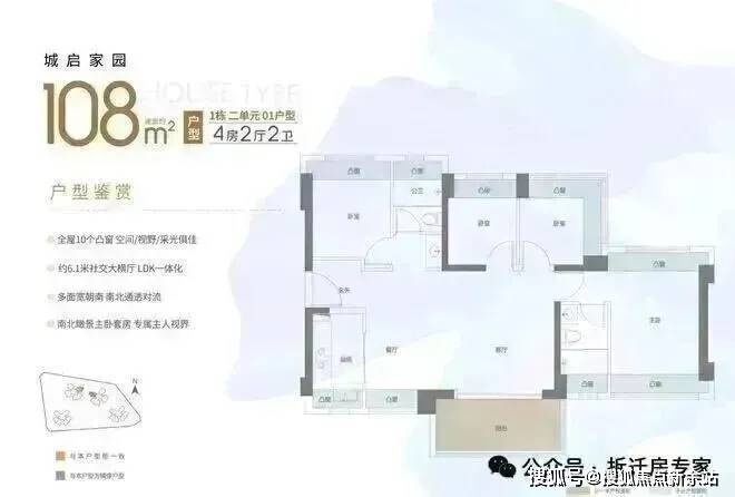 108㎡的4房2厅2卫,设计的是横厅南北通透格局,进门独立玄关,客餐厅6.4米开间,LDKB一体化,五开间朝南,主卧双飘窗通透设计,全屋10个凸窗,4个卧室分别做到了主卧17.01㎡/次卧9.7㎡/次卧8.4㎡/次卧7.35㎡(包含墙体飘窗),L型厨房,卫生间干湿分离,得房率约91.88%(包含赠送),阳台主朝西南或东南向。