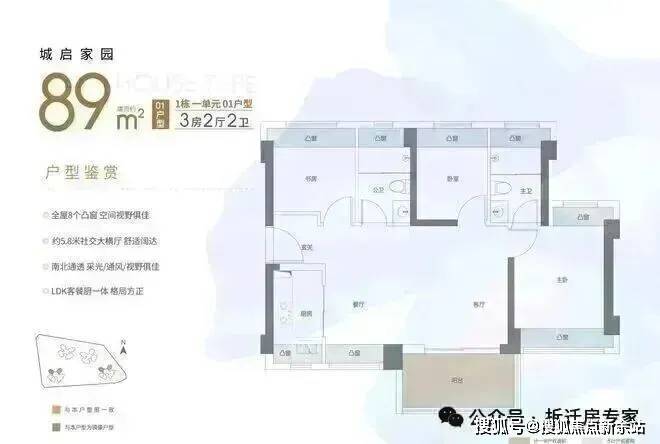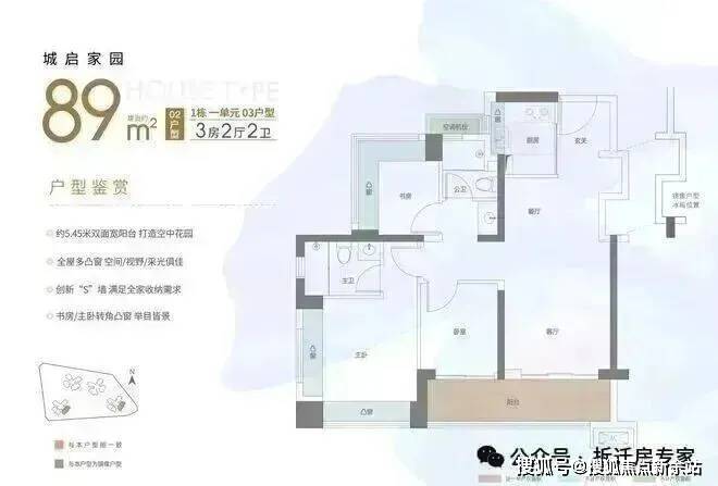 89㎡的3房2厅2卫,02.03户型,设计的是经典竖厅格局,客厅3.4米开间,LDKB一体化,S墙设计预留冰箱卡槽位,动静分区,三开间朝南,3个卧室分别做到了主卧13.79㎡/次卧7.62㎡/次卧6.93㎡(包含墙体飘窗),主卧+1个次卧270°飘窗设计,U型厨房,公卫三段式分离,客厅连接卧室出5.75米长的大阳台,得房率约87.2%(包含赠送),东南朝向。