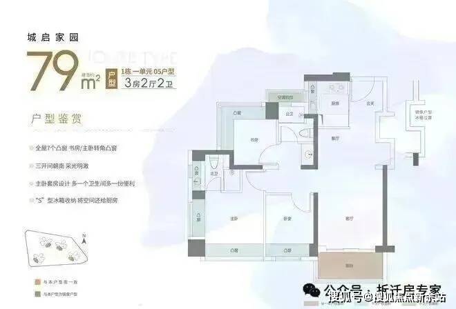 79㎡的3房2厅2卫,设计的是经典竖厅格局,客厅3.3米开间,LDKB一体化,S墙设计预留冰箱卡槽位,动静分区,三开间朝南,3个卧室分别做到了主卧12.1㎡/次卧7.36㎡/次卧6.67㎡(包含墙体飘窗),主卧+1个次卧270°飘窗设计,U型厨房,公卫三段式分离,得房率约88%(包含赠送),东南或西南朝向。