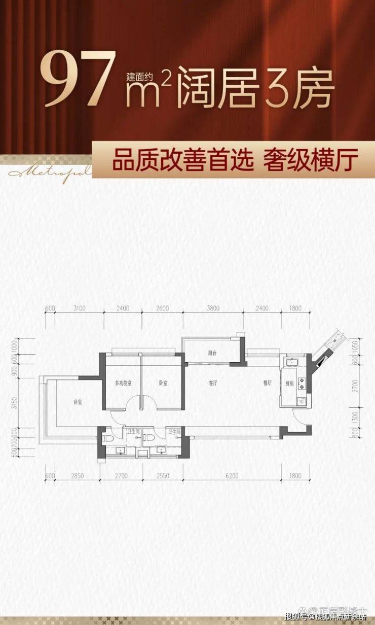 97平方米横厅户型以6.2米面宽迎接南向日光,主卧13.87平方米尺度尽显从容;