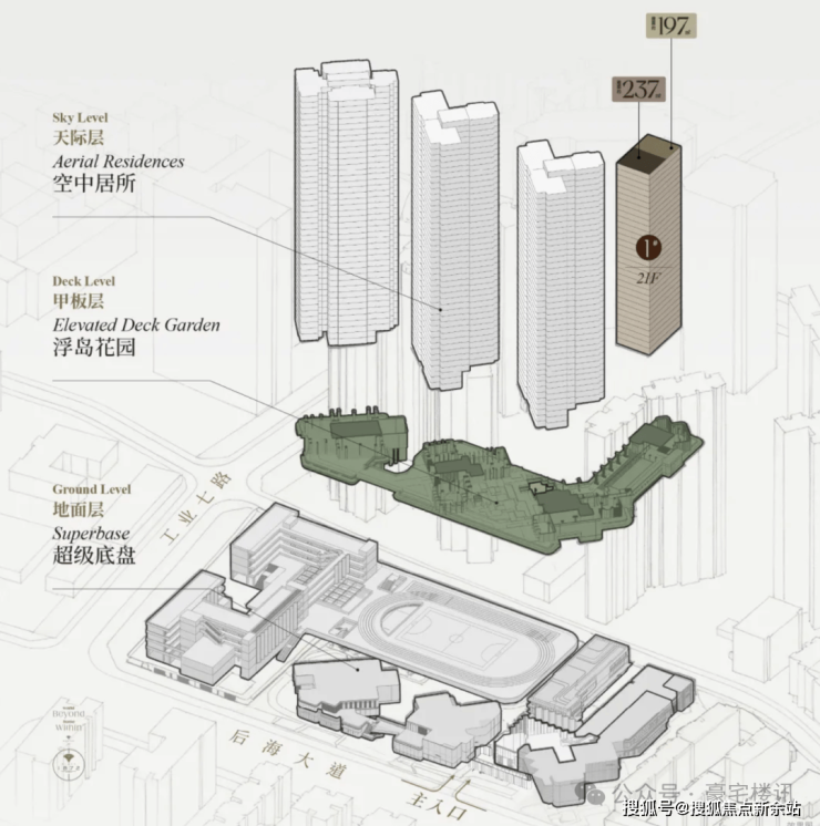 招商玺在建筑设计上采用了创新的“浮岛甲板"策略,四栋住宅落于甲板之上,独享甲板庭院花园,进而形成超级社区底盘+浮岛绿化甲板的垂直共生人居标杆。