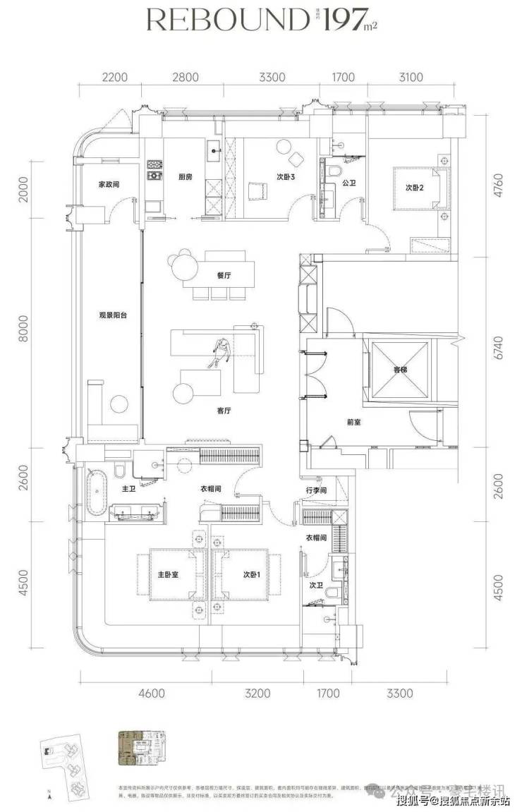 约197㎡ 四房三卫两厅、三面采光、主卧套房、270°转角奢华空间全景落地窗。