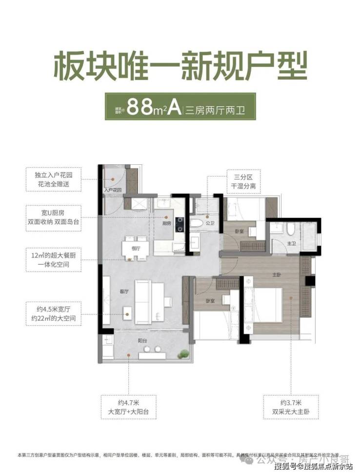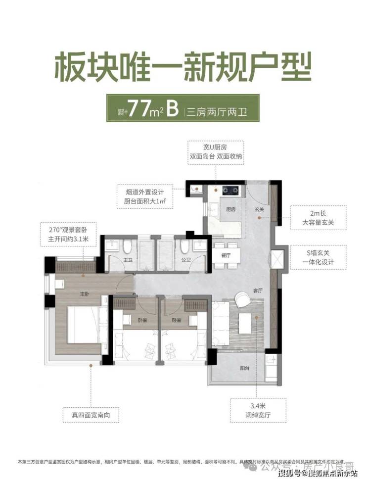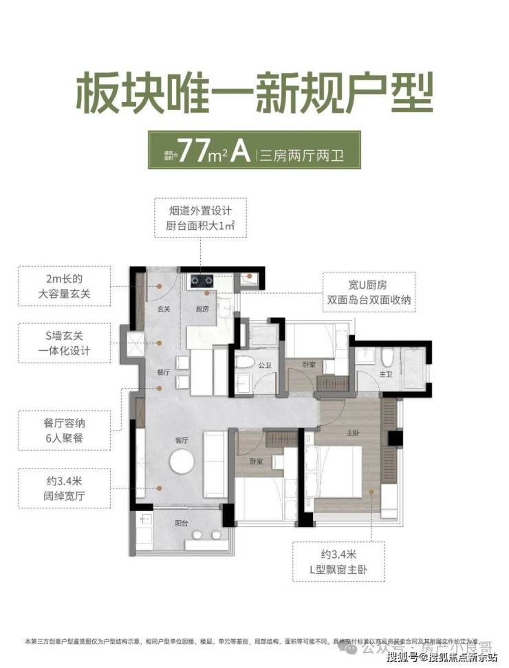 户型神操作总价稀缺度77㎡三房3.4米巨厅+双卫,秒变100㎡