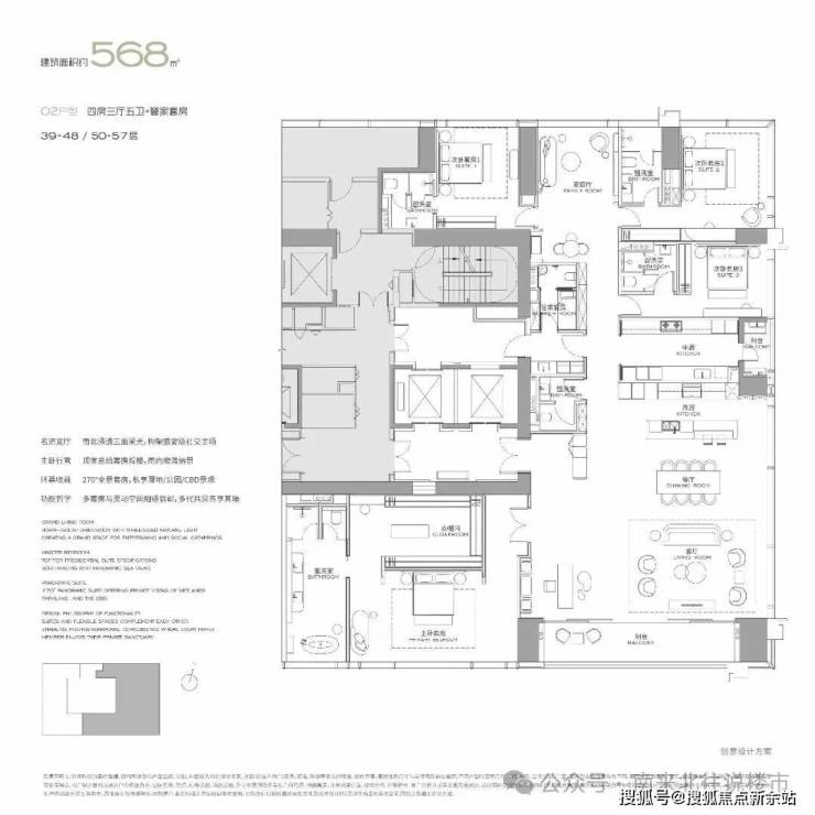 【户型规划】由4栋51至63层3.6-3.9米层高的纯居住奢装交付地标、两栋4.5米层高的小高层,35栋独栋,全景幕墙、宽景阳台。