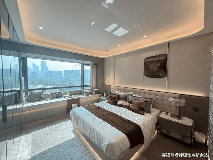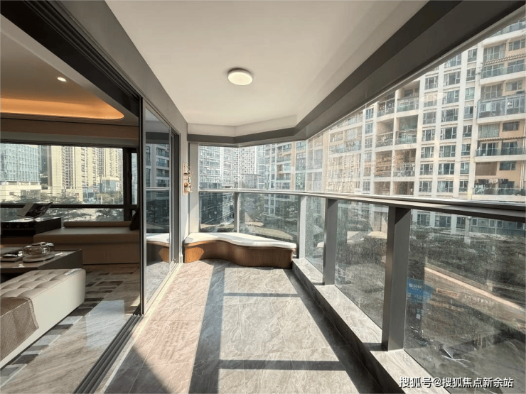 122㎡ A/B户型:视野同样受限,几乎被项目自身的商业大厦遮挡,仅能从两栋楼之间的缝隙隐约看到湾区书城和欢乐港湾。