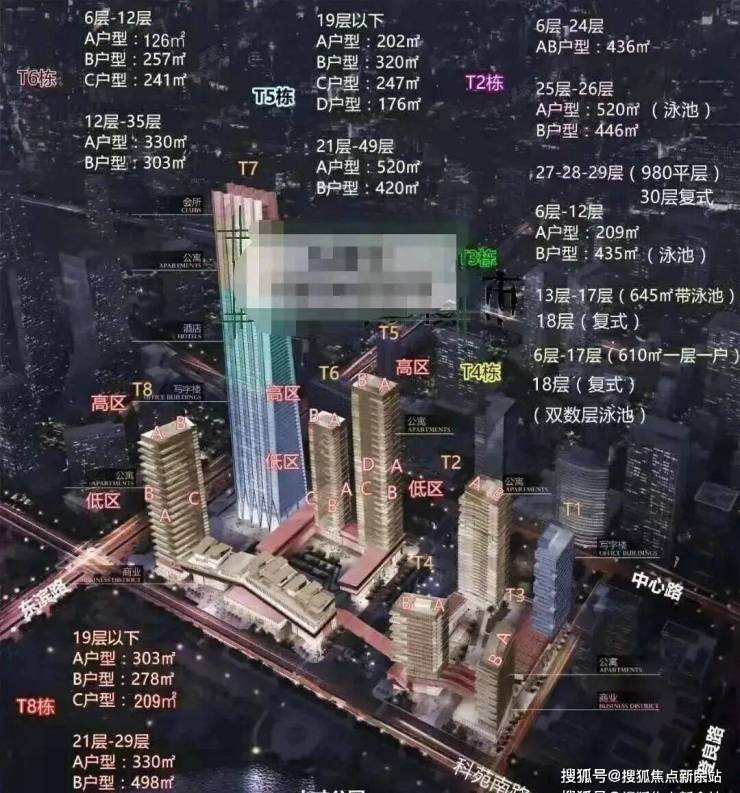 南区分为:T5、T6、T8公寓,T7为环球商务中心。