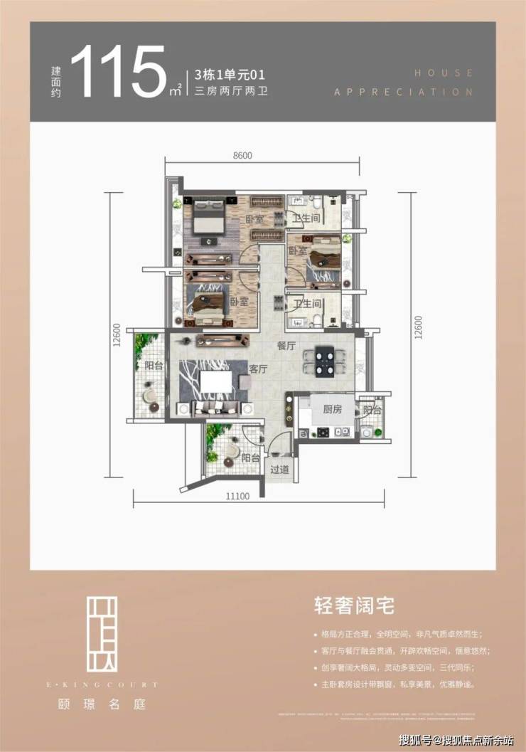 3栋1单元01户型,115平方3+1房两厅两卫
