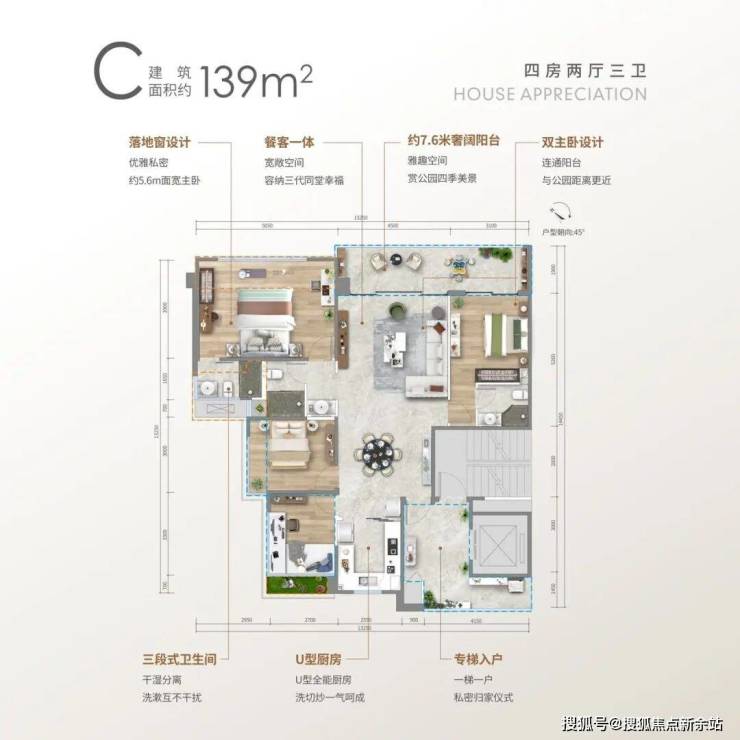 C户型: 约139㎡四房两厅三卫、层高25层