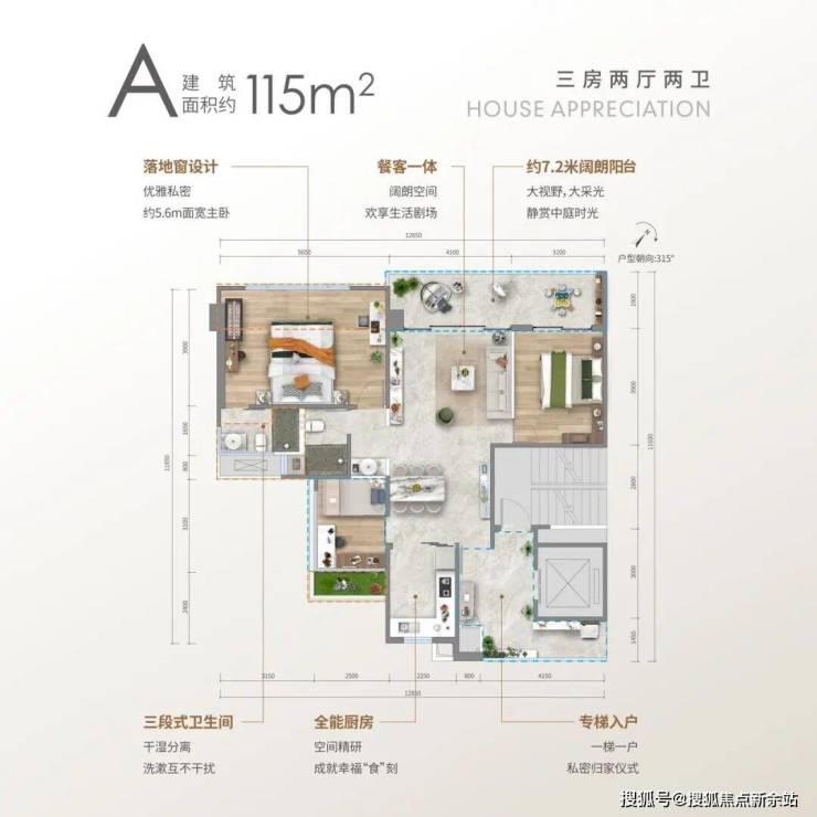 A户型: 约115㎡三房两厅两卫、层高22层
