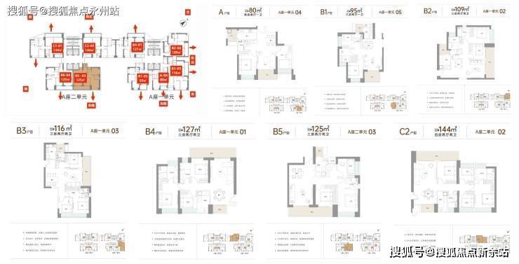 项目主推户型为建面约80-144㎡产品,其中3房为主力户型,有建面约109㎡、116㎡、125㎡、127㎡可选,此外,也有上车小户80㎡2房、95㎡3房1卫单位,及见面约144㎡的改善户型。