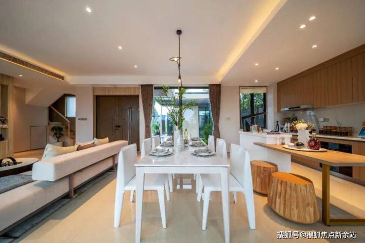 采用全开放式的客饭厅设计,拥有超宽阔的空间感,无论做饭、看电视还是坐着发呆,一家人都能感应彼此的存在。