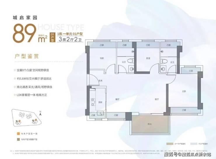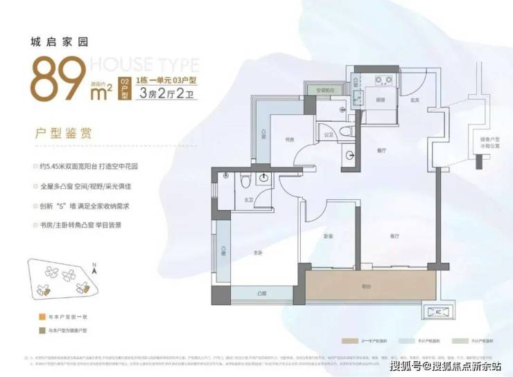89㎡的3房2厅2卫,02.03户型,设计的是经典竖厅格局,客厅3.4米开间,LDKB一体化,S墙设计预留冰箱卡槽位,动静分区,三开间朝南,3个卧室分别做到了主卧13.79㎡/次卧7.62㎡/次卧6.93㎡(包含墙体飘窗),主卧+1个次卧270°飘窗设计,U型厨房,公卫三段式分离,客厅连接卧室出5.75米长的大阳台,得房率约87.2%(包含赠送),东南朝向。