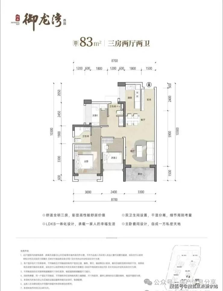 83㎡3房2卫,分布在2栋1/2单元02/05户型,设计的是竖厅格局,客厅开间3.3米,LDKB一体化设计,三开间朝南,U型厨房,公卫三段式分离设计!