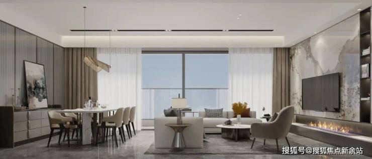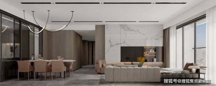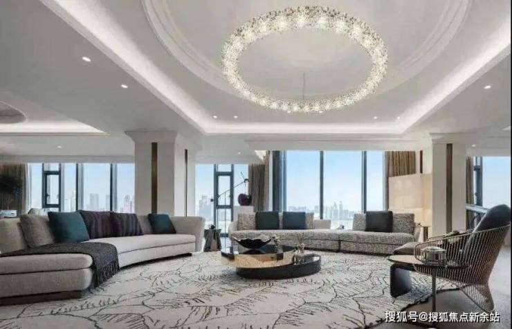 再来看客厅,作为家中的礼仪中枢,外连约20.8米长的L型瞰江阳台,270°IMAX景观,塔尖高端排面,细节设计体现出非凡尊崇礼遇。