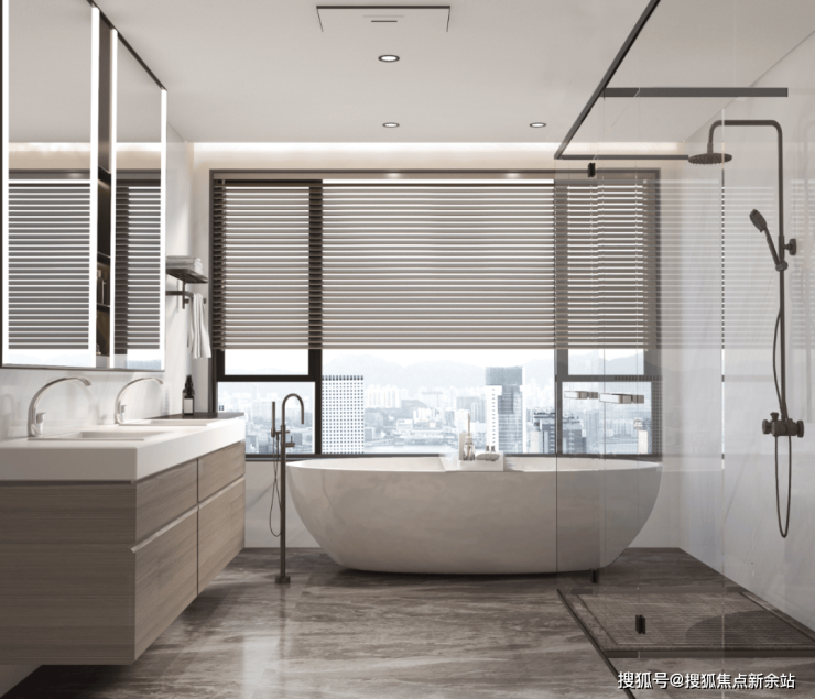 约14㎡的卫浴间配置双台盆洗漱区、独立马桶区,独立淋浴区,独立的浴缸泡澡区,尽享舒适。