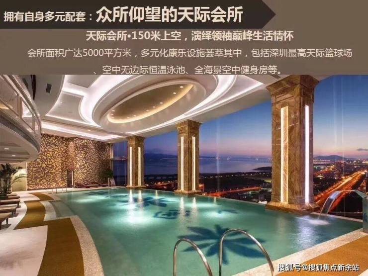 150米高空天际会所,拥有天际恒温泳池、空中篮球馆、健身房、SPA瑜伽馆等丰盛配套。