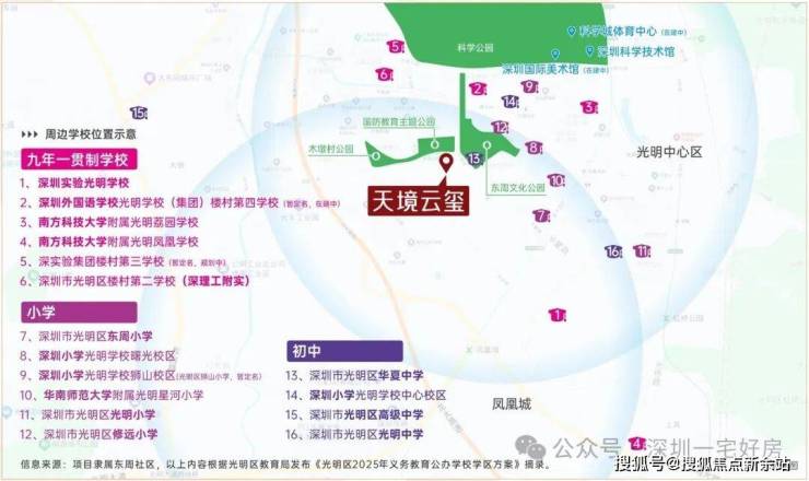 项目周边教育资源丰富且优质,紧邻华夏中学、华南师范大学附属光明星河小学,东周学校也在步行范围内,其中华师附小为区域内知名教育资源。根据光明区2025年学区划分,项目小学学区划分在光明小学、东周小学、华南师范大学附属光明星河小学、修远小学、深圳小学光明曙光学校、南方科技大学附属光明凤凰学校、南科大荔园学校等;初中学区划分在光明中学、华夏中学、深圳实验光明学校、光明高级中学、南方科技大学附属光明凤凰学校、南科大荔园学校等。区域内规划有22所学校,包括深圳外国语学校光明学校、南方科技大学附属荔园校区等多所市属名校分校,教育资源密度与质量均处于光明区前列。