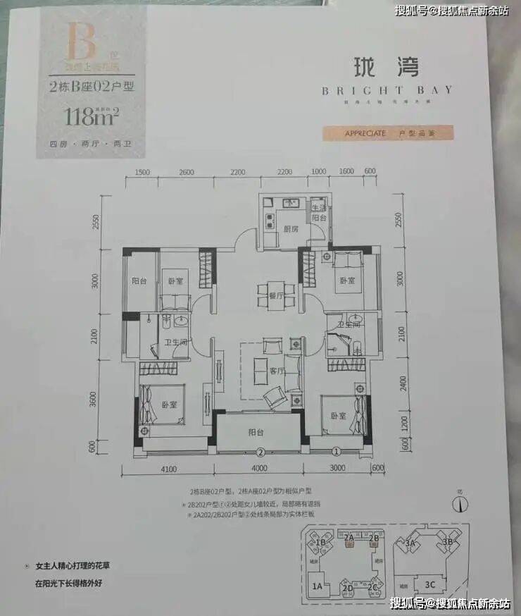 这个户型有1条腿,位于2B座01户型,这个户型为横厅设计,南北通透的格局,阳台开间6.4米的豪气,缺点是处于2B座最边上位置,景观不佳,与一期的3A座可能会有点对视,私密性没那么好。
