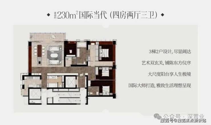户型特点:南北通透、大落地窗、双玄关设计,部分户型带家政套间,实用率约80%。