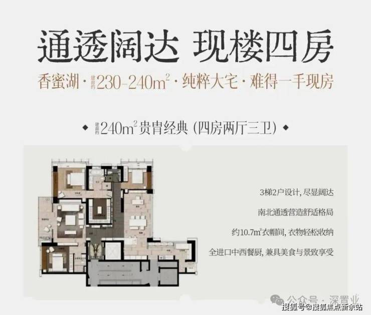 (1/2/3/4/5栋均为240㎡4房双套间)240㎡客厅出阳台,南北通透,功能分区合理。南向6.5*1.85约12米超大阳台,宽敞明亮。主卧宽敞舒适,双面采光,超大衣帽间。餐厨空间独立具有良好的自然通风采光条件。主要结构开间进深比稍有不足,主卧衣帽间不可自然通风采光,不可做卧室使用,自由改造功能受限。老人房卫生间不可自然同分采光,向餐厅开门,对私密性有一定干扰。