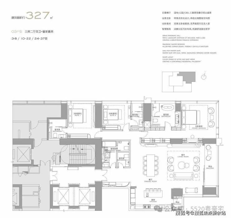 公寓主力户型为303㎡、326㎡、404㎡、572㎡等大平层,最大户型达1000㎡