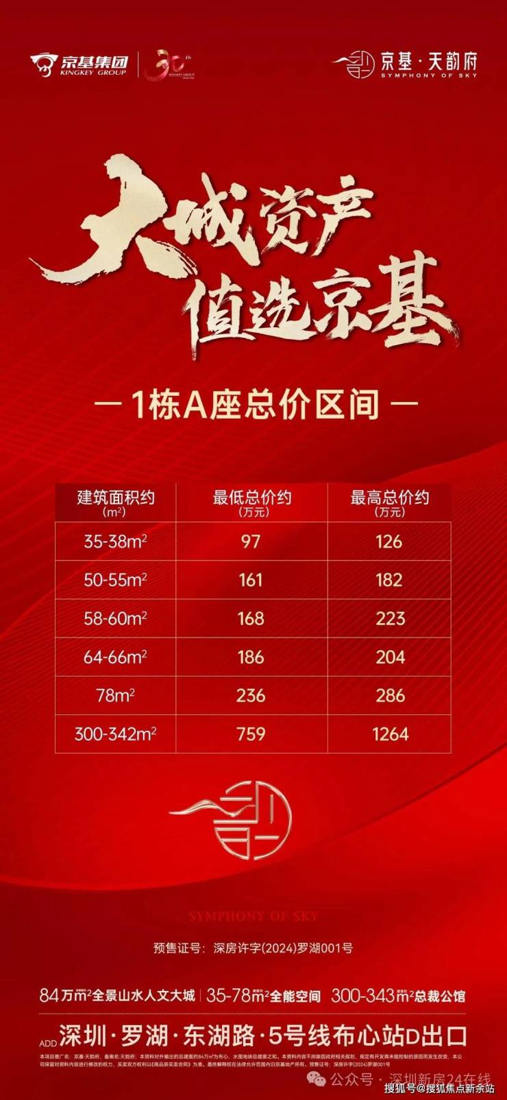 城启城市大封面京基集团作为与深圳特区共成长的主力军始终与城市的发展脉络同频,生于罗湖,长于罗湖蓬勃壮大于罗湖,所以京基更懂罗湖深研罗湖人居与精神需求的变化,将人文情怀与城市新生融于一体,不断引领人居体验升级,为城市唤起新的活力基于对罗湖理想人居的洞察,在30而屹的重要节点京基集团集30年城市地标打造经验,择址世界罗湖芯匠造集湖山雅宅、金粹公寓、商务峯面、商业集群等多元业态于一体的总建面约84万m全景山水人文大城,首发之作京基.天韵府!以超配大城首发住宅建面约70-180m²湖山雅宅,助推城市向新,刷新人居想象,除了住宅以外还有70年产权的公寓产品35-340㎡